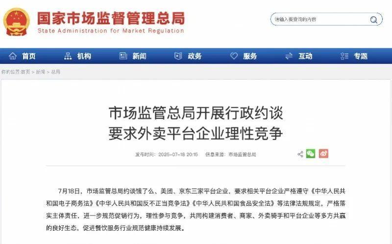 今天(7月18日),市场监管总局约谈饿了么、美团、京东三家平台企业,要求相关平台企业严格遵守《中华人民共和国电子商务法》《中华人民共和国反不正当竞争法》《中人民共和国食品安全法》等法律法规规定,严格落实主体责任,进一步规范促销行为,理性参与竞争,共同构建消费者、商家、外卖骑手和平台企业等多方共赢的良好生态,促进餐饮服务行业规范健康持续发展。(来源:新华社)